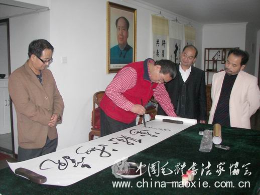 (协会通讯员 蔡巧莲)2010年10月18日上午,中国毛体书法家协会会员马仁安老师专程从河南来到协会,向协会展示了他用8个月时间完成的“烙书”作品——毛主席诗词83米长卷。中国毛体书法家协会副会长兼秘书长孔维阳、中国毛体书法家协会会员张志红、张学明看了马老师的作品,非常震惊,被马仁安老师的执着精神深深吸引。各位老师相互交流思想,探讨毛泽东书法艺术的发展方向。