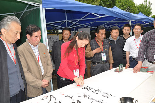 这次因参展人员较多,所以我们组织了新老会员同台竟艺,依次顺序是:辛敏延(辽宁)、邢振文(辽宁)、李建明(广东)、余斯文(北京)、李金铎(安徽)、梁宝玉(山东)、李岐海(山东)、刘三民(河南)、李润东(黑龙江)、赵爱玲(河南)、郭胜霞(河南)、王炳坤(山东)周淮河(安徽)、 宫天吉(辽宁)、曹文英(山东)、郭剑琼(福建)、许文灿(山东)、周广云(安徽)、李营(江苏)。没有参加書写长卷的会员都在长卷上签了名作为纪念,他们是:廉芳林(辽宁)、 李士侣(广东) 谷国荣(广东) 孔维阳(山东)、李荣好(辽宁)唐新德(广西)、马光学(山西)、张强(山东)、张岁让(甘肃)、彭士平(山东) 周超(四川)、翟德泉(北京)、韩平(辽宁)、陈文友(吉林)等。签名结束后,李金铎代表协会在长卷后写下了“毛体书法中国行走进上海世博会”,整个长卷气壮山河,圆滿成功,代表着中国毛体书法家协会广大会员的心愿,永远珍藏在上海世博会特色文化馆。