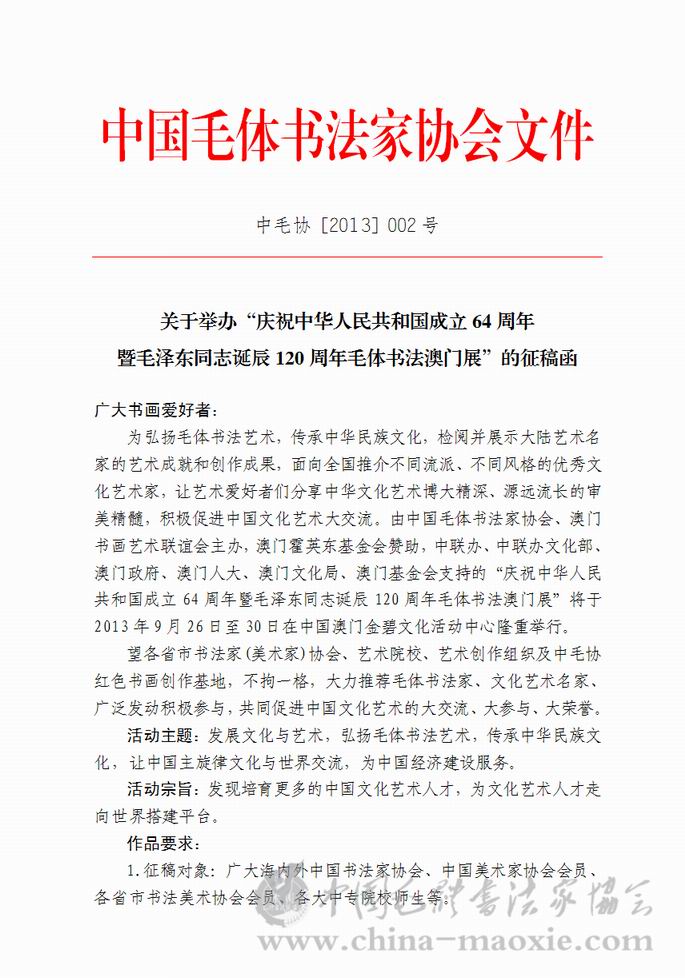 中毛协 [2013] 002号 关于举办“庆祝中华人民共和国成立64周年暨毛泽东同志诞辰120周年毛体书法澳门展”的征稿函